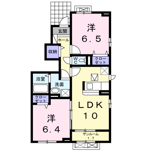 - LDK10帖、洋室6.5帖、洋室6.4帖